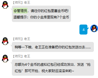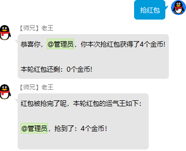 - 发红包:用金币发红包(为防止误触发,需要@老王)