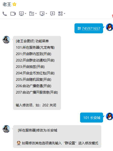 (这个功能使用方法跟群聊是一样的,私聊的作用主要是让管理员悄悄的改设置,不打扰其他人)