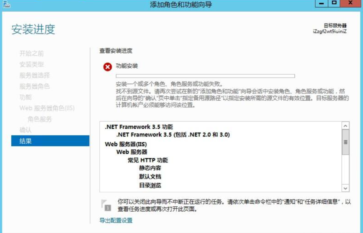 在云服务器上装个应用,需要用到.net3.5,按正常操作从控制面板的增加windows功能安装失败,打开服务器管理器,选择“添加角色和功能”,和下图一样提示。