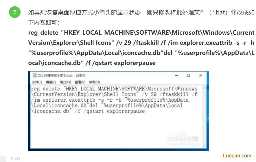 reg add "HKEY_LOCAL_MACHINE\SOFTWARE\Microsoft\Windows\CurrentVersion\Explorer\Shell Icons" /v 29 /d "%systemroot%\system32\imageres.dll,197" /t reg_sz /f taskkill /f /im explorer.exe attrib -s -r -h "%userprofile%\AppData\Local\iconcache.db" del "%userprofile%\AppData\Local\iconcache.db" /f /q start explorer pause